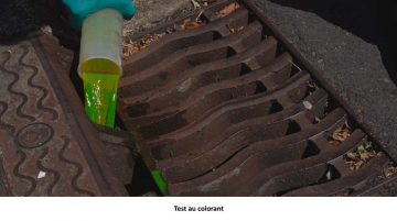 - Lorsque le test à la fumée détecte une situation anormale, ou qu’il n’est pas possible de réaliser des tests à la fumée, la mise en œuvre d’un test complémentaire au colorant permet de confirmer la non-conformité du branchement d’une habitation au réseau. Un colorant est versé dans le réseau de l’habitation afin de suivre son écoulement. Ce colorant non toxique est également utilisé dans les milieux naturels pour le traçage des cours d’eau ainsi que dans le domaine médical.